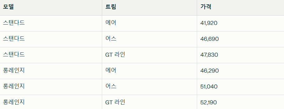 기아 EV4 신형은 스탠다드와 롱레인지 두 모델에 각각 에어, 어스, GT 라인 세 가지 트림으로 구성되어 있으며, 트림별 가격과 주요 옵션에서 차이를 보입니다.