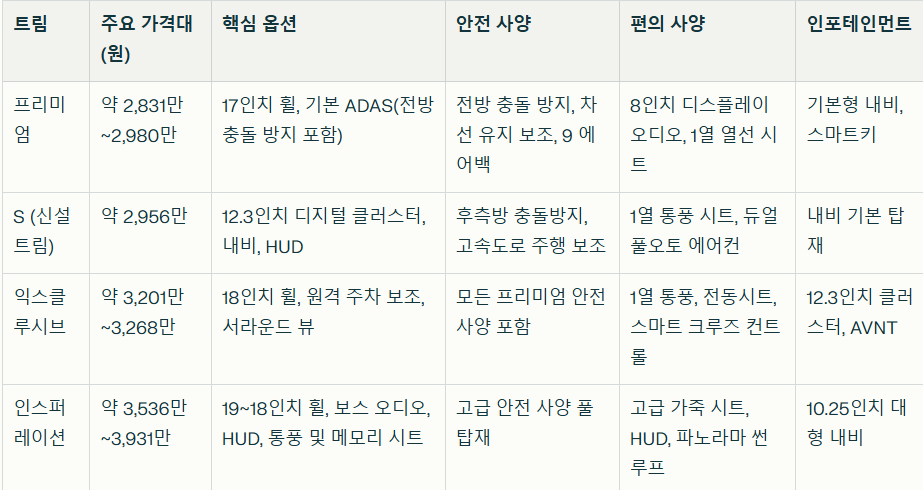 프리미엄은 기본 안전과 편의가 충실하고 가성비 중심의 트림입니다. S 트림은 실속형으로 인기 옵션을 묶어 가격 부담을 줄였으며, 주요 운전자 보조 시스템과 편의사양이 포함됩니다.