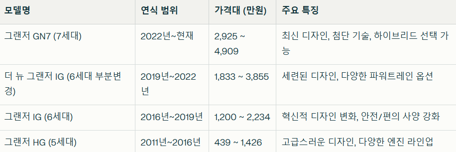 하이브리드 모델은 위 가격대보다 다소 높으며, 최신 GN7 하이브리드는 약 3,615만 원에서 4,947만 원까지 형성